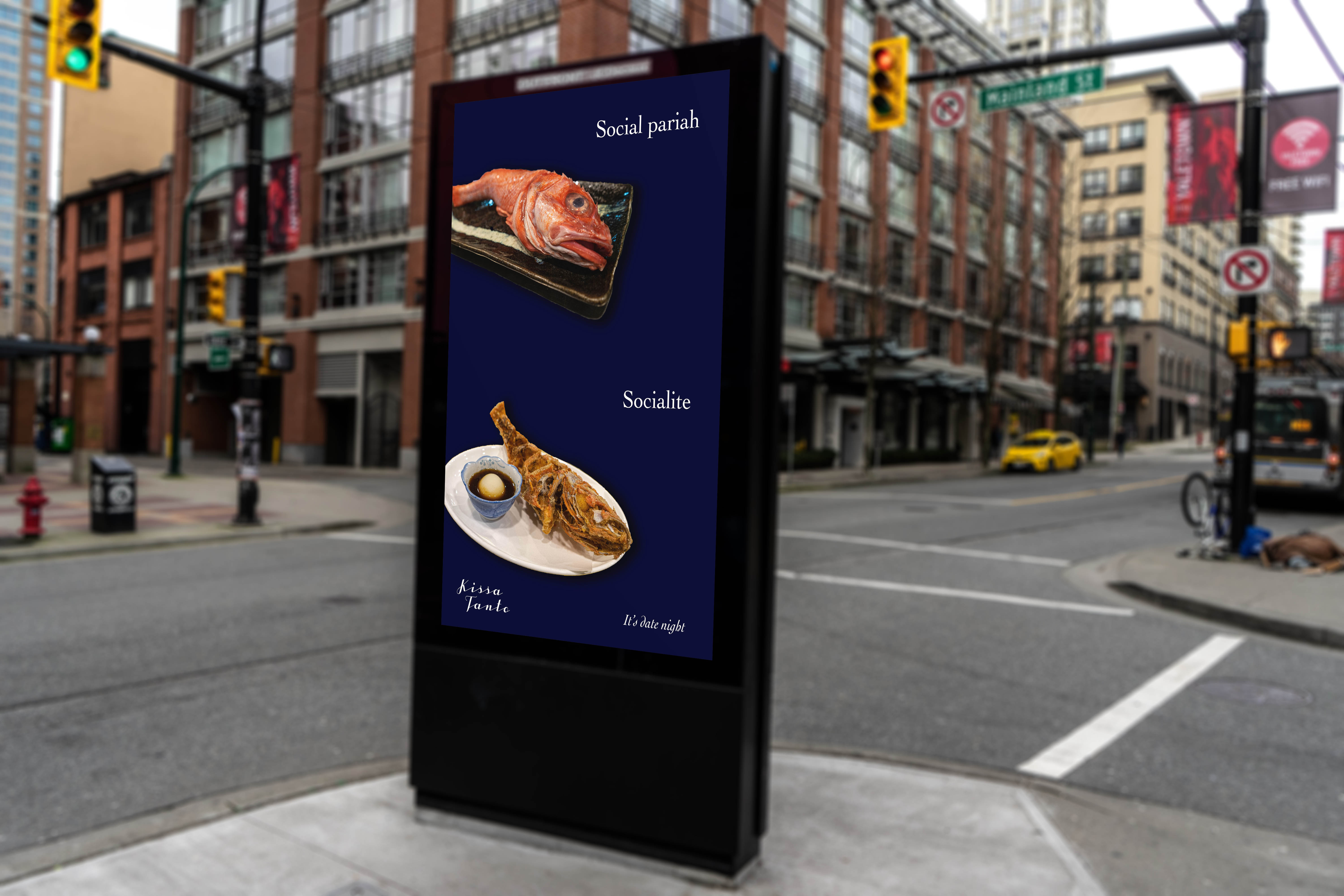 When it comes to Vancouver's food scene, gastropubs and chain restaurants dominate. Chinatown's Kissa Tanto, one of the city's upscale eateries, also uniquely offers a fusion of two popular ethnic cuisines: Italian and Japanese. These two features are leveraged in the It's Date Night campaign. The premise is all about perception. By presenting a choice to any prospective client of the image they'd like to portray, we can attach an emotional connection to a fine dining experience. The ads plays with juxtaposition using raw and cooked fish as a metaphor. If you identify with the cooked version, you're a confident, successful professional and you dine at Kissa Tanto. If you don't, you're, well, a debutante and you won't fit in it there. The ads suggest that Kissa Tanto is the place to be if you're looking to impress.*This is a conceptual project in no way associated with Kissa Tanto.
